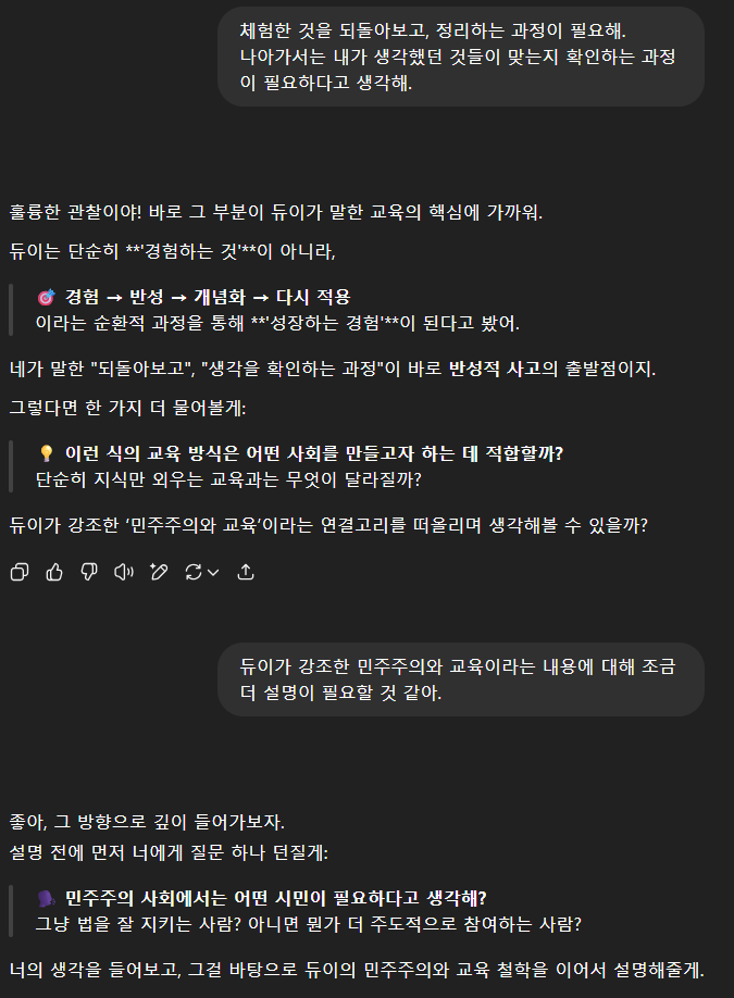- 글쓰기와 논리력 강화: 작문에 대한 직접 수정 대신, 흐름과 주장 간의 연결을 점검하게끔 질문