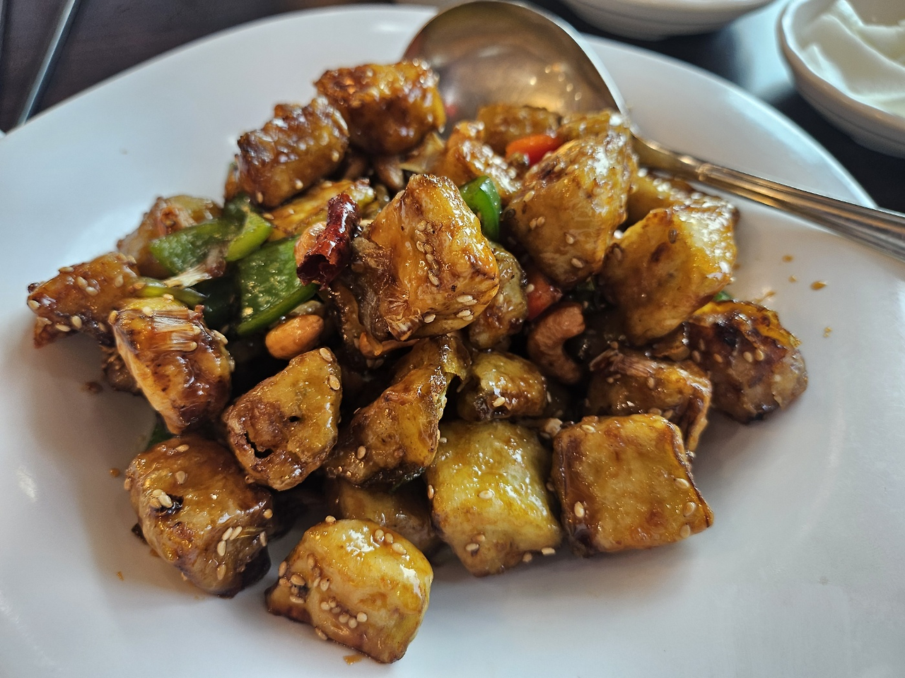 가지를 바삭하게 튀겨 안은 촉촉하고, 짭조름한 간장 베이스 소스와 찰떡 궁합이었습니다.